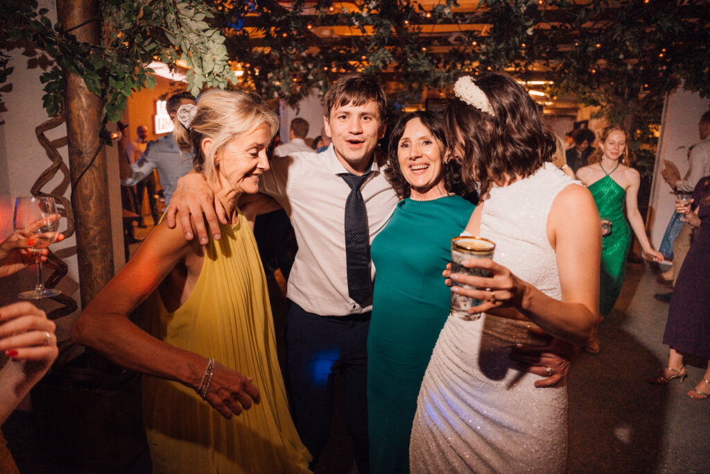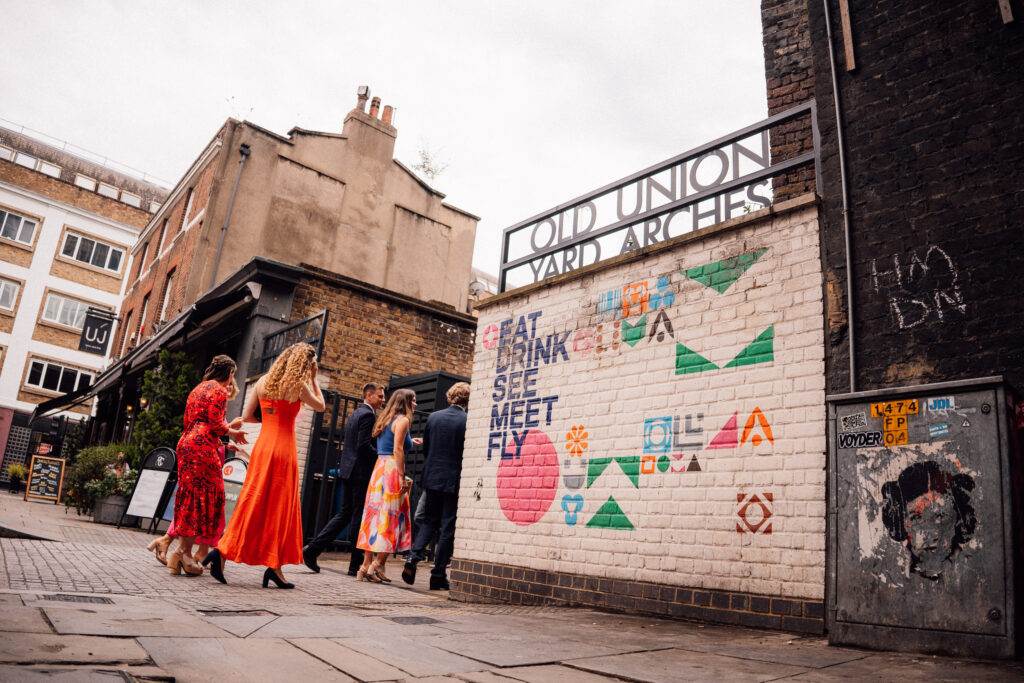 All the guests hopped onto London buses and travelled on to the vibey Union Street Theatre for their wedding reception. UST is not usually a reception venue, but Abigail from Rather Be coordinated services from a couple of different restaurants and suppliers to make it work so we could be closeby to Gordon Ramsay’s Bread Street Kitchen for dinner.