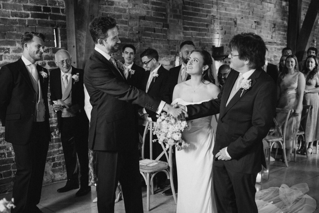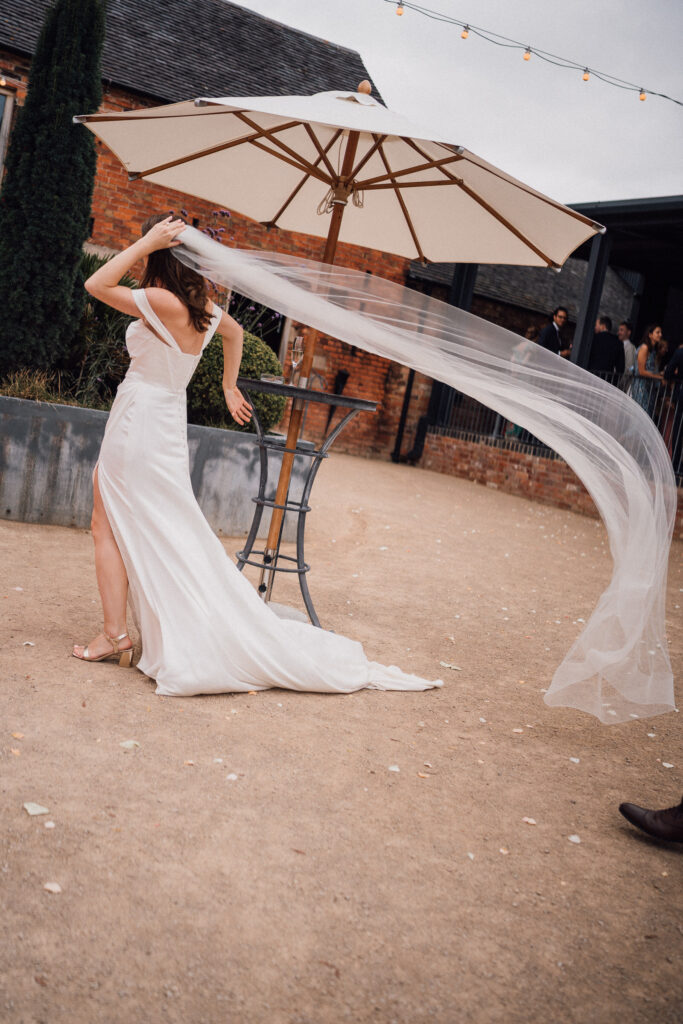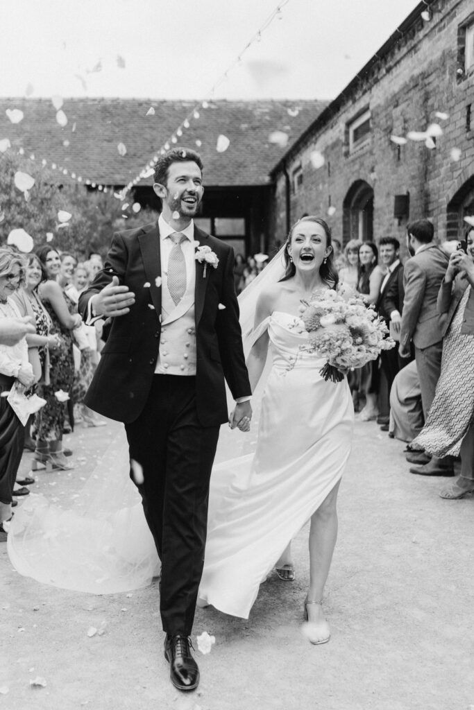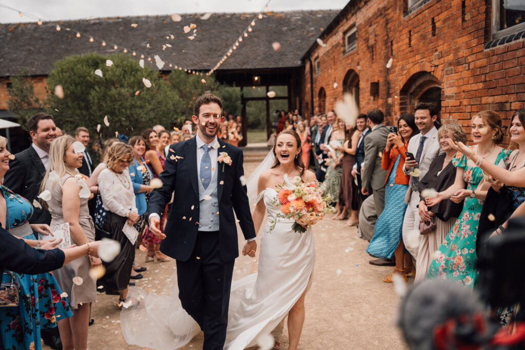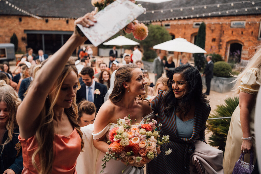 The ceremony itself was beautiful and emotionally grounded, followed by some of the most joyful confetti we’ve seen. Just after that moment, the rain arrived properly – one of those classic British wedding-day shifts. Rather than interrupting the flow, it became part of the story, bringing people closer together and adding atmosphere to the afternoon.