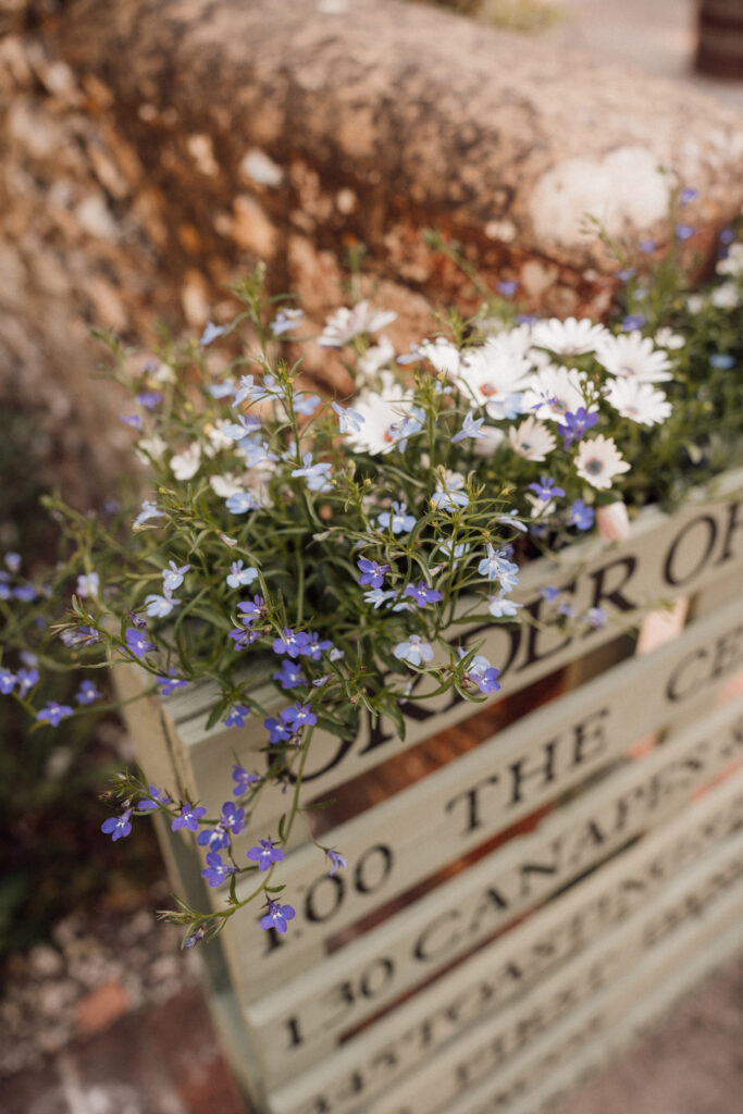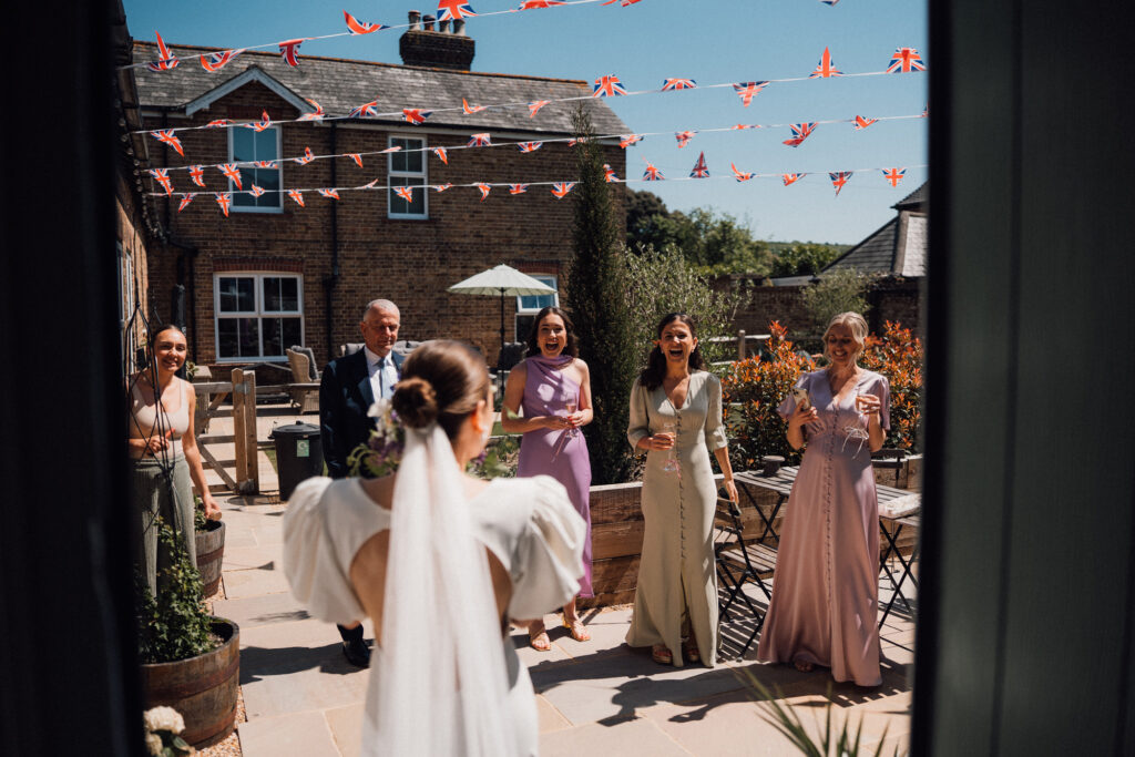 Rather than leaning into anything overly traditional, they shaped the day around a garden party style atmosphere. The setting did a lot of the work for them: open countryside, spring light, big skies and plenty of space to move at your own pace. It felt sociable and easy, with guests naturally drifting between conversations, drinks and moments rather than being ushered from one thing to the next. It’s exactly the kind of South Downs setting that suits couples who love the outdoors but want their wedding to feel modern, informal and full of life.